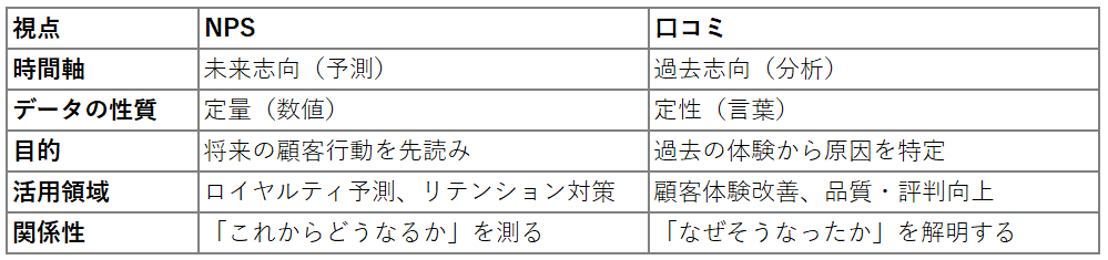 口コミ・レビューとNPSの最大の違いのひとつが、「時間軸(現在分析か、未来志向か)」にあります。以下では、その違いを軸にして両手法の特徴・活用方法・組み合わせ方をわかりやすく整理します。