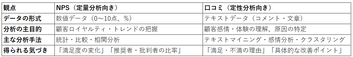 NPSは定量データとして扱えるため、主に数値分析・傾向分析に強みがあります。