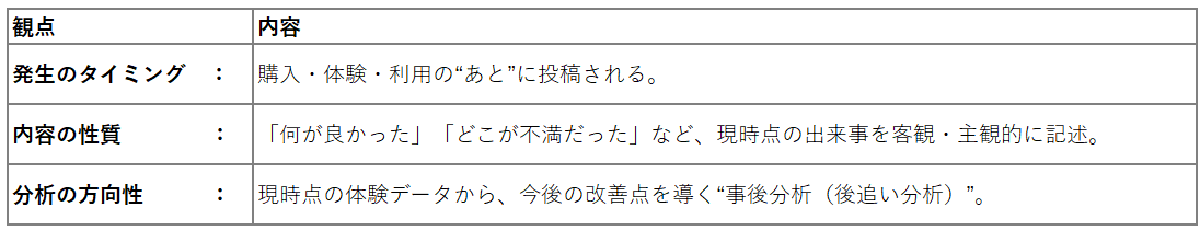 要するに、口コミは「現在の顧客体験をどう改善するか」を示す振り返りデータです。